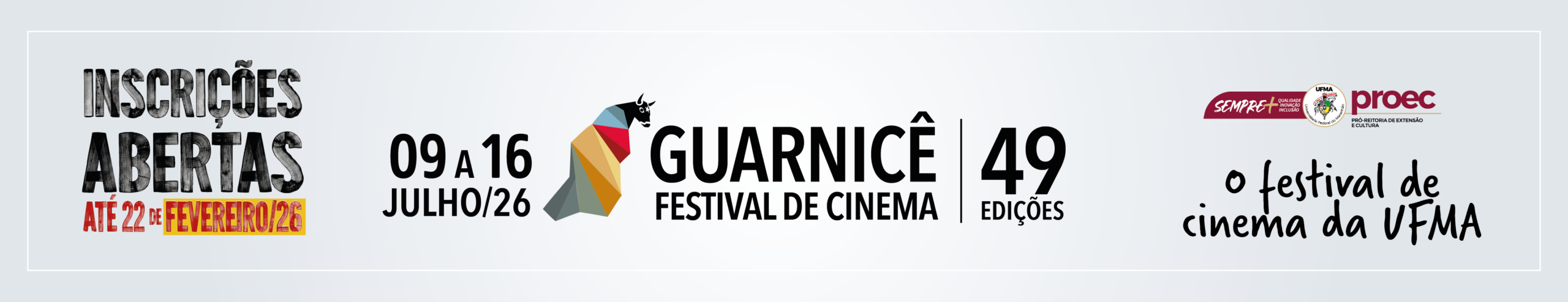 A Universidade Federal do Maranhão, por meio da Pró-Reitoria de Extensão e Cultura e da Diretoria de Assuntos Culturais, informa que o prazo de inscrições para a 49ª edição do Festival Guarnicê de Cinema foi prorrogado até 01 de março. A decisão atende aos pedidos de interessados de diferentes regiões do país, que solicitaram mais tempo para concluir e enviar suas obras.